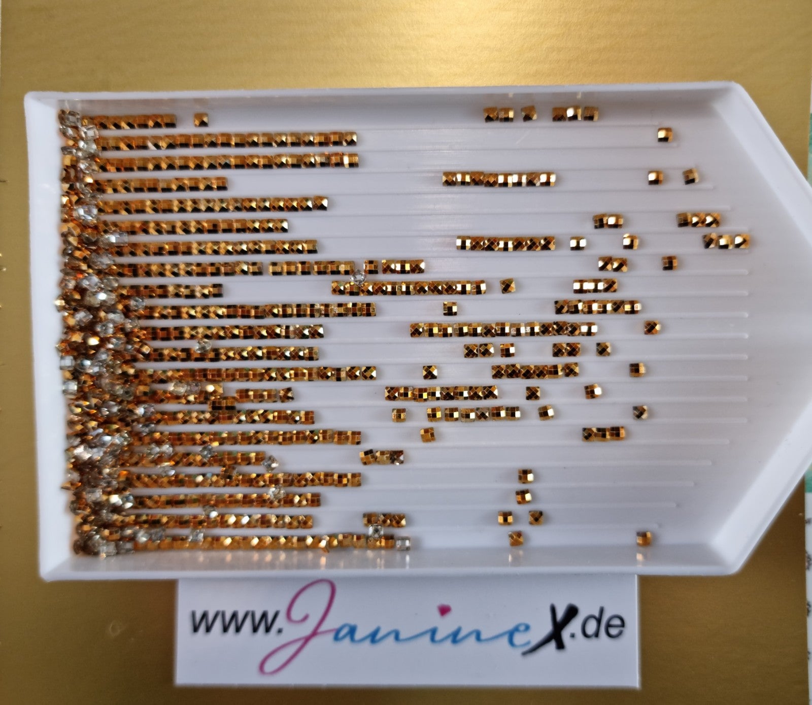 Verkauft werden Diamond Painting metallic Steine in gold eckig (square).