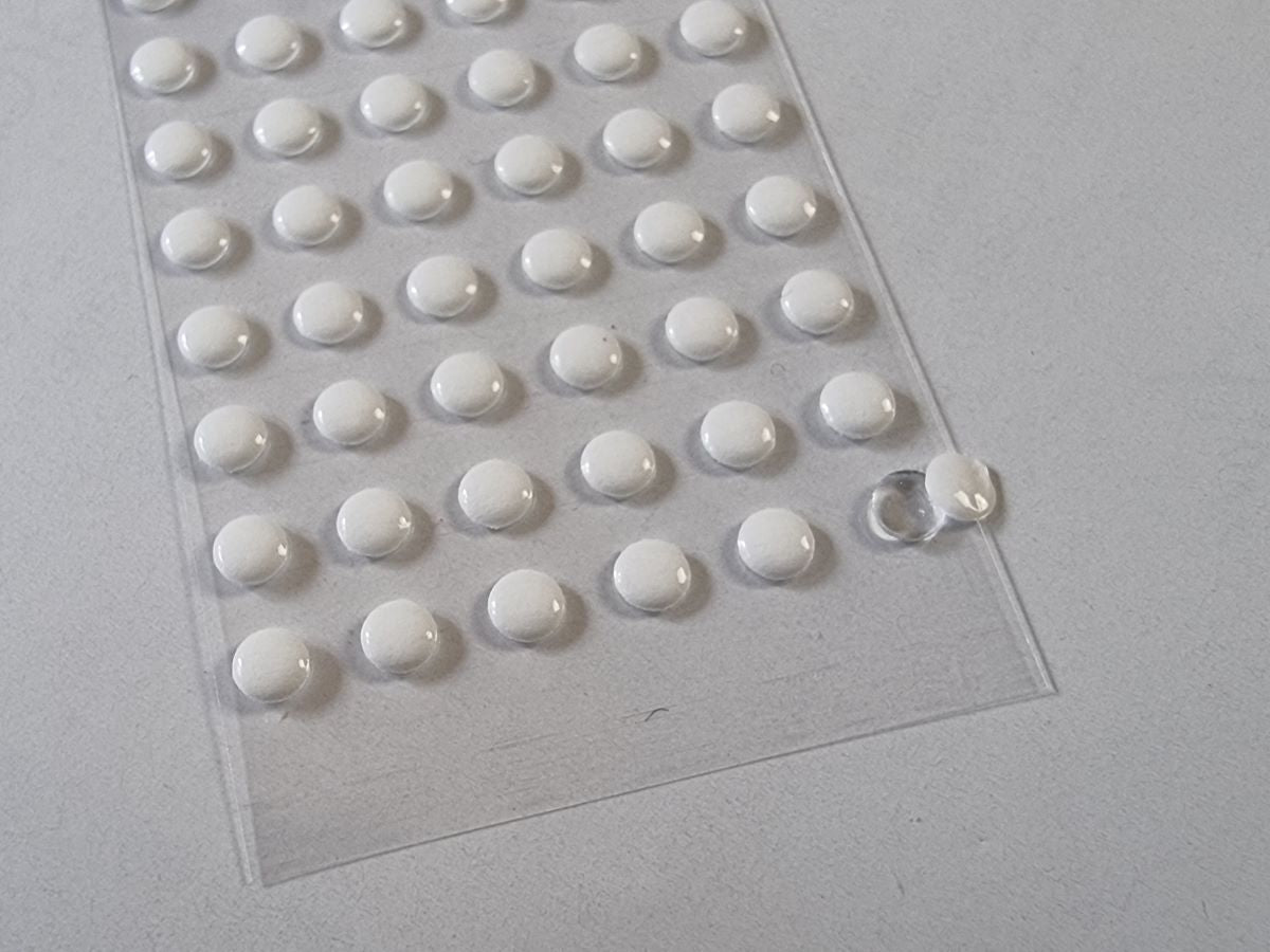 Die Klebepunkte sind transparent und haben einzeln eine weiße Schutzkappe drauf. Den weißen Deckel kannst du mit etwas Übung mit einer Pinzette gut lösen.