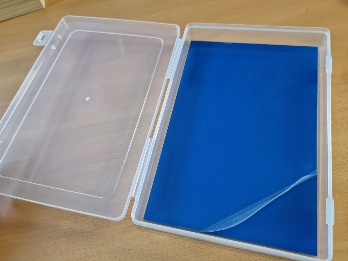 Kunststoff Magnetbox - transparent klein+flach mit blauer Platte