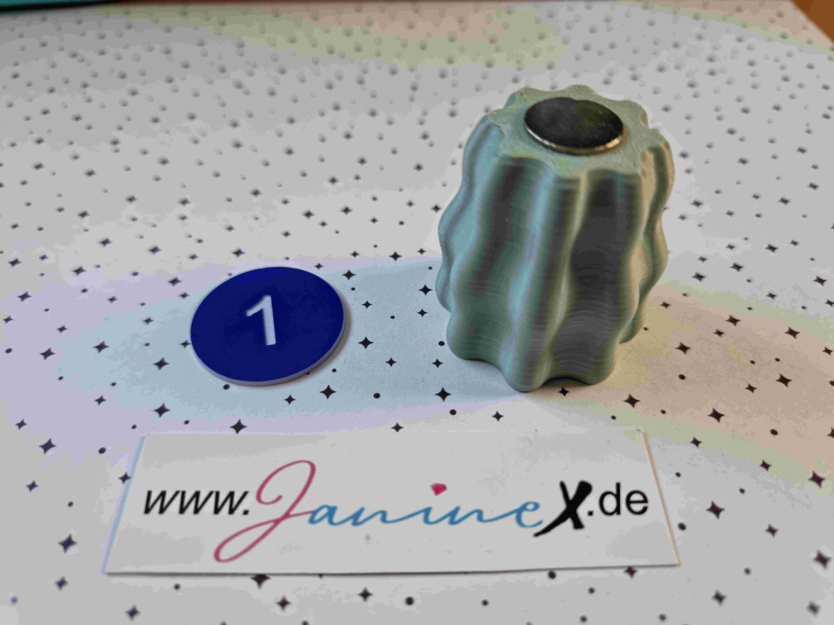 "Welli" ist etwa 4,3 cm hoch und oben 4,1 cm breit (Standfläche ist 2,7 cm) und hat einen grossen Magneten an der Unterseite.