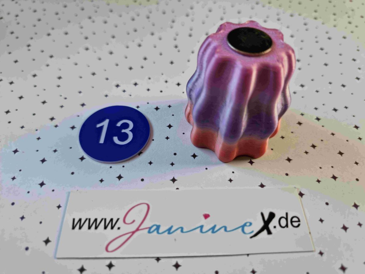 "Welli" ist etwa 4,3 cm hoch und oben 4,1 cm breit (Standfläche ist 2,7 cm) und hat einen grossen Magneten an der Unterseite.