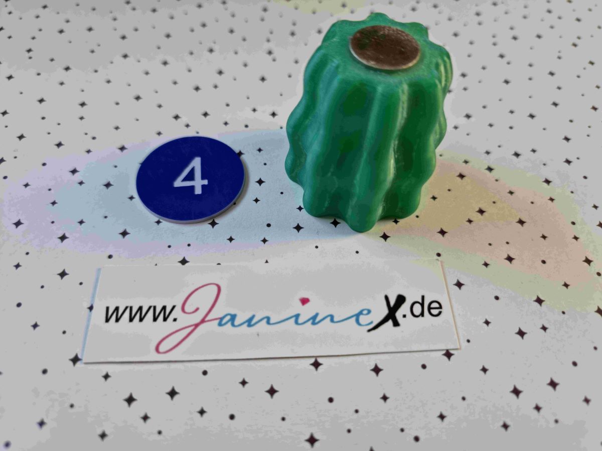 "Welli" ist etwa 4,3 cm hoch und oben 4,1 cm breit (Standfläche ist 2,7 cm) und hat einen grossen Magneten an der Unterseite.