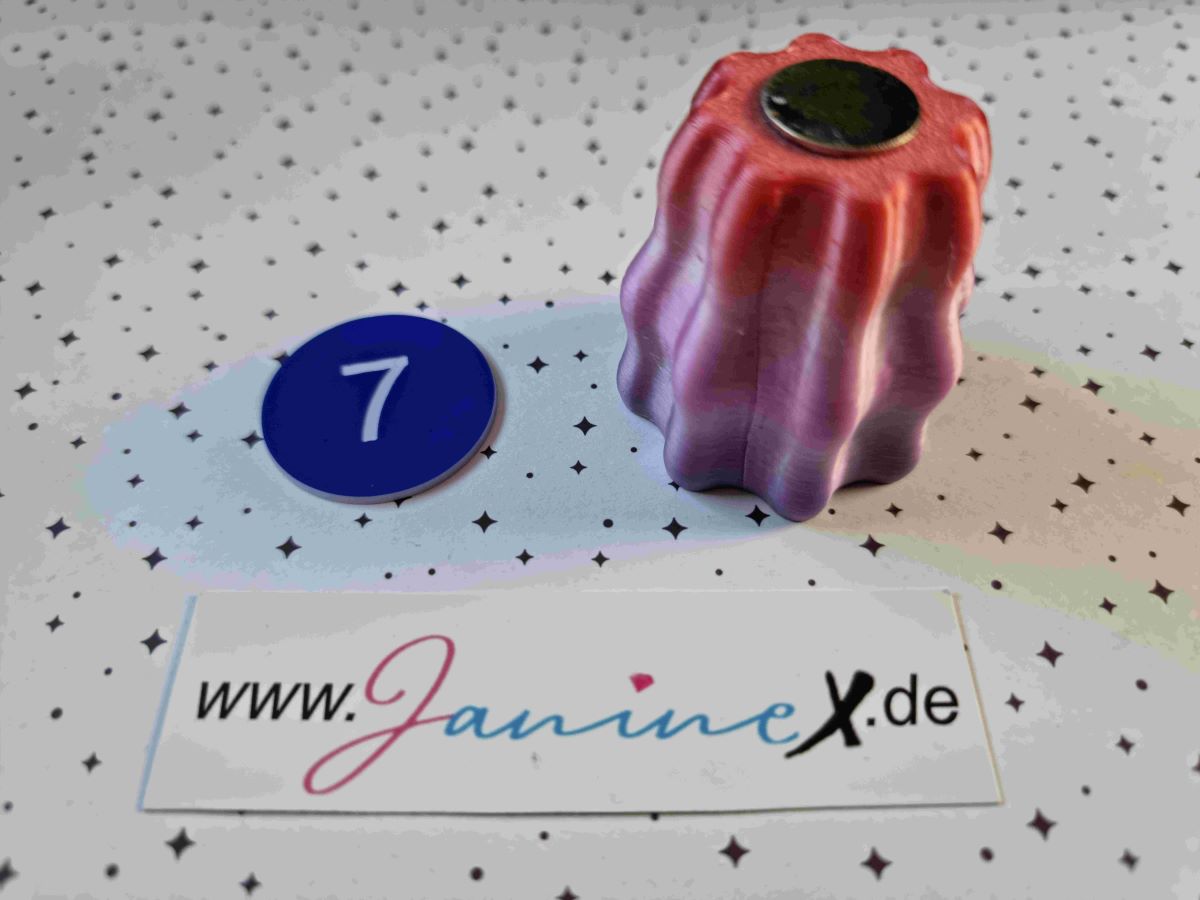 "Welli" ist etwa 4,3 cm hoch und oben 4,1 cm breit (Standfläche ist 2,7 cm) und hat einen grossen Magneten an der Unterseite.