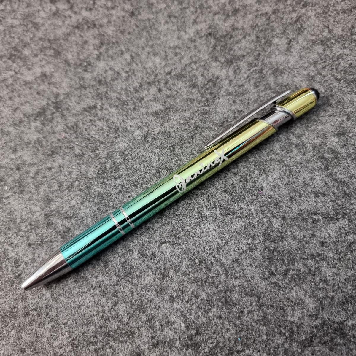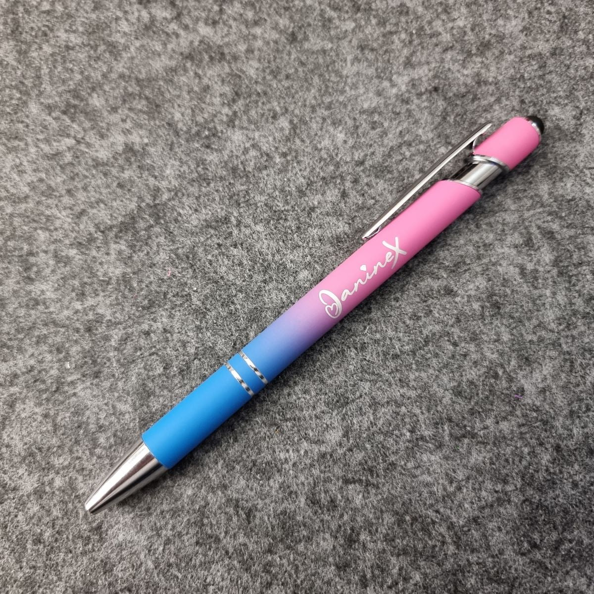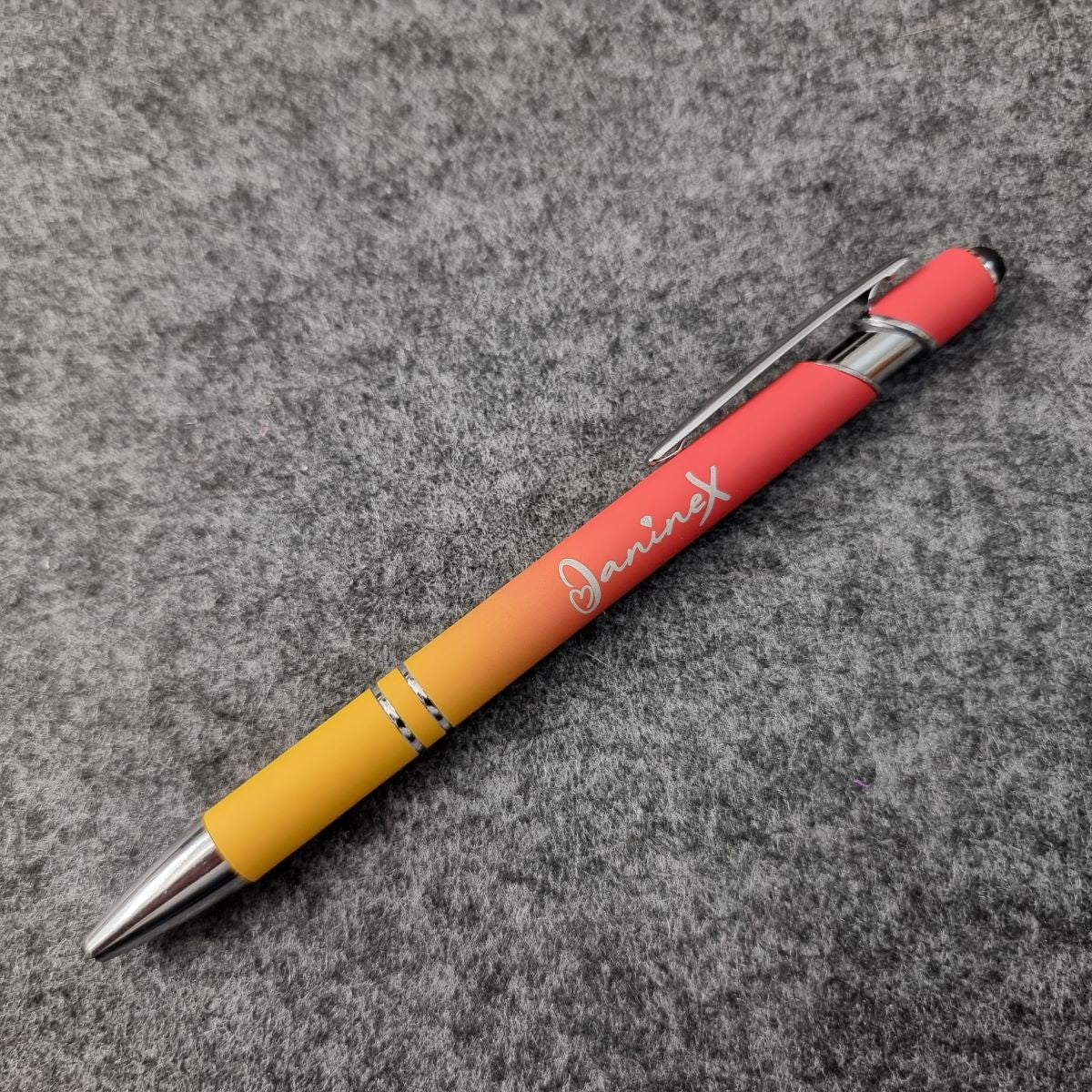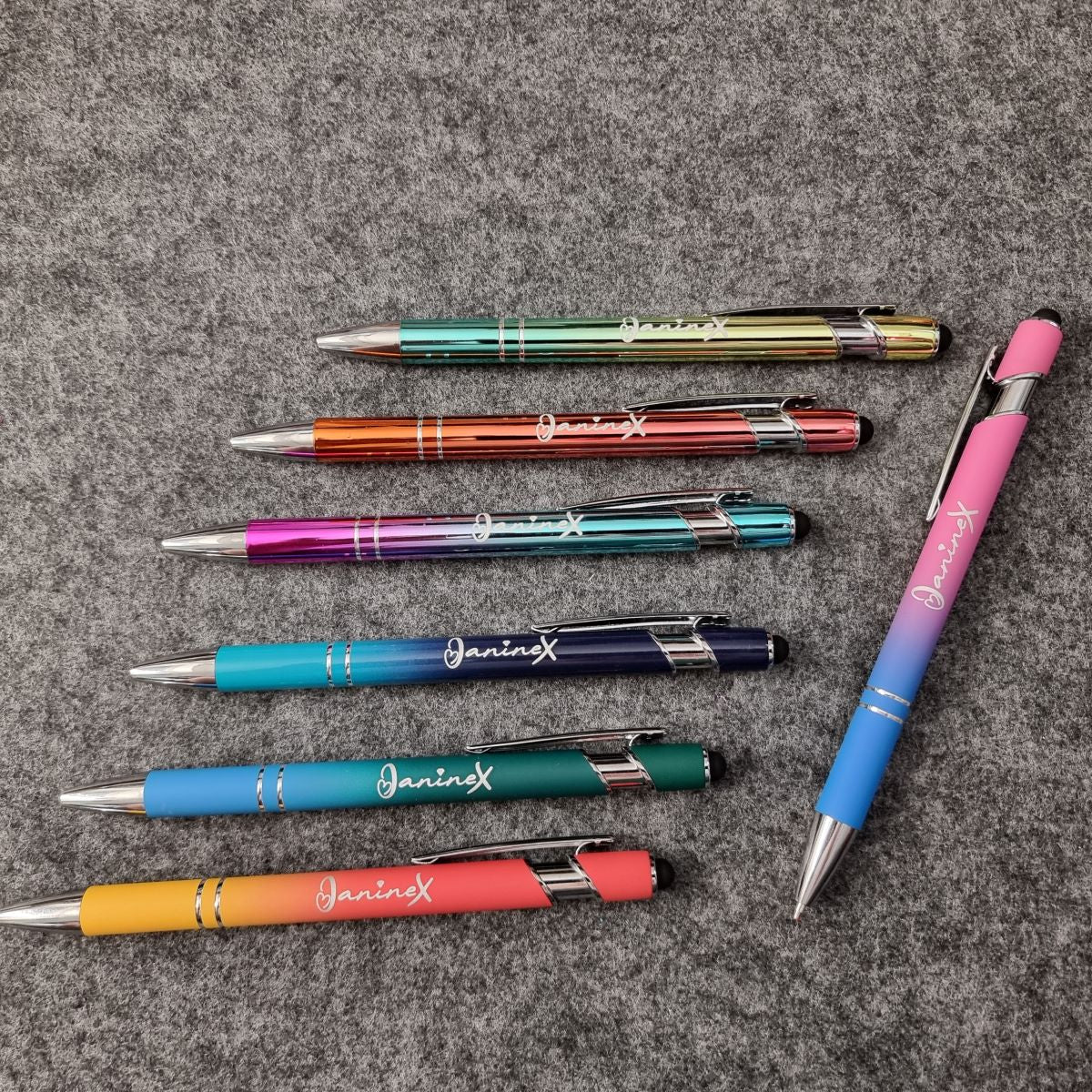 Kugelschreiber mit Verlaufsfarbe mit Logo JanineX - silberfarbene Elemente