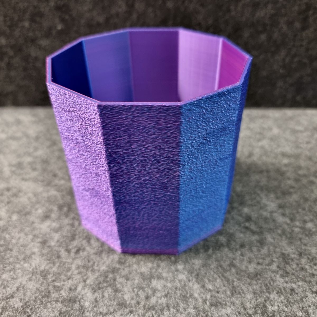 Stiftebecher aus Kunststoff (PLA) im Korbdesign mit einem Duchmesser von 10 cm und einer Höhe von 9 cm.
