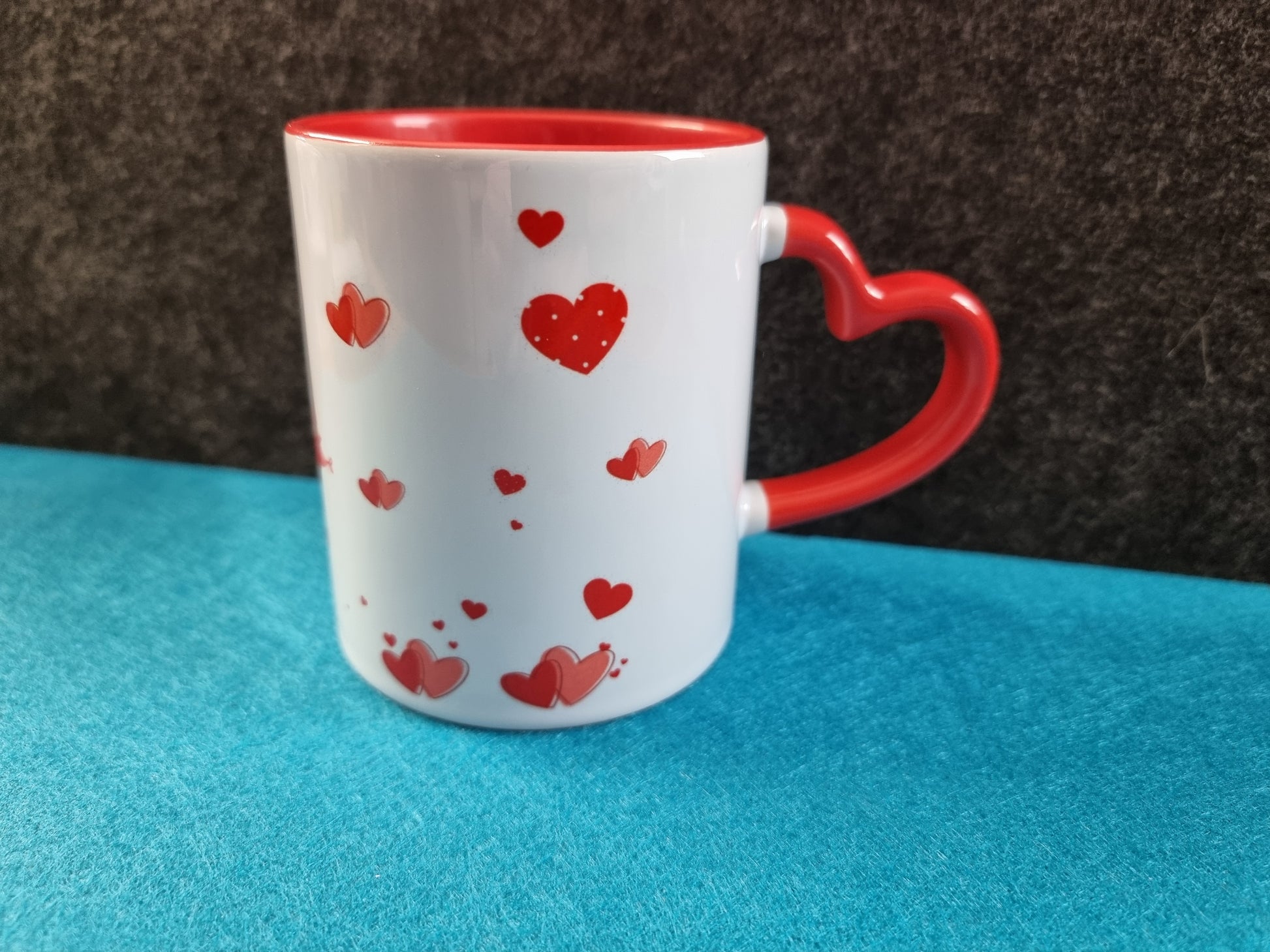 Die Tasse hat einen hübschen Herzhenkel und innen eine rote Beschichtung.